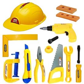 IndusBay Construction Equipments Tools Toy Set for Kids Boys - Pack of 13 Piece Engineering Workshop Tool kit with Safety Helmet & Equiments,Yellow,Pl
